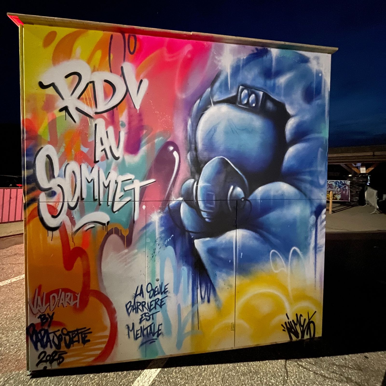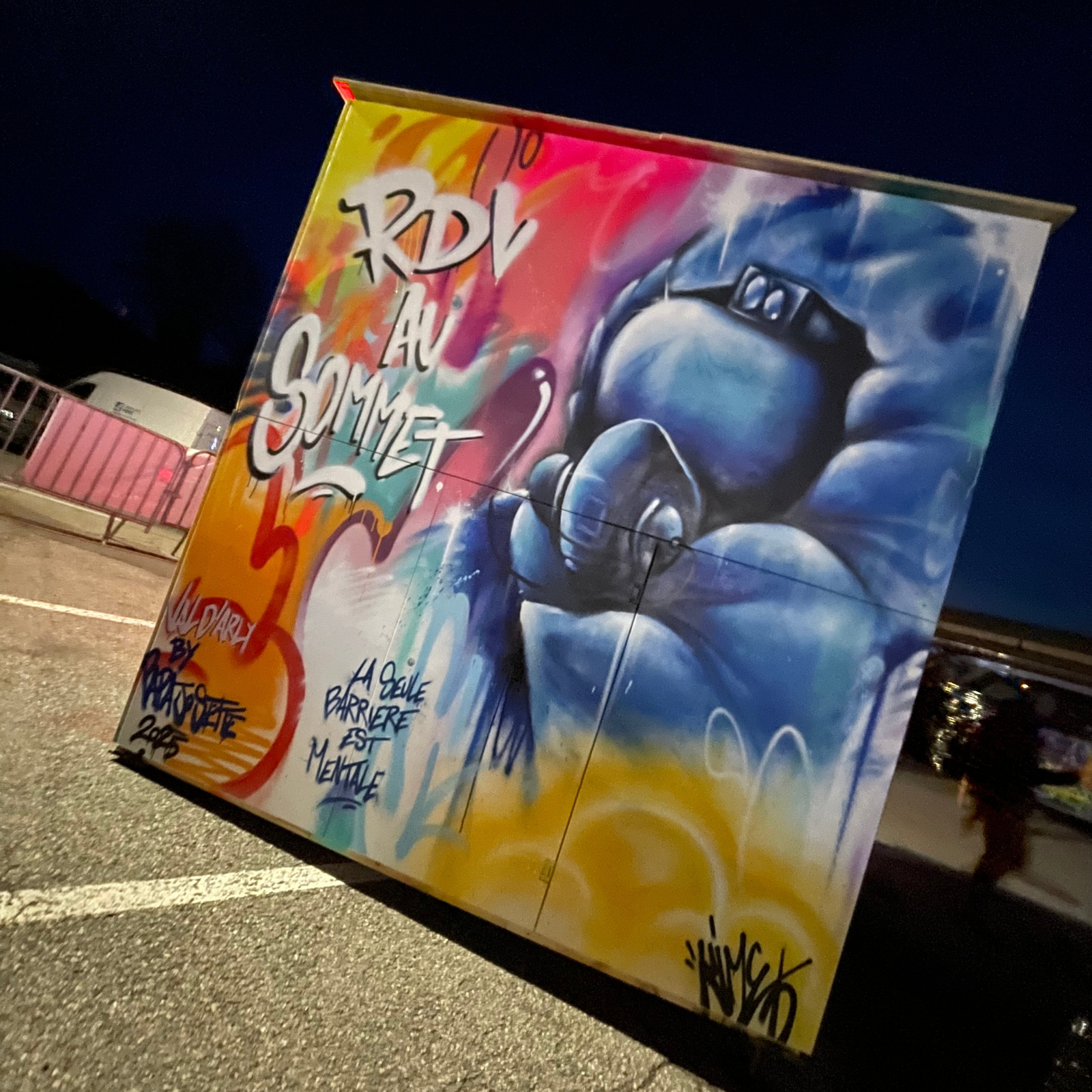 Pour cette édition, j’ai eu la chance de réaliser une fresque haute en couleur, une œuvre pensée comme une invitation à prendre de la hauteur, à rêver et à se dépasser.